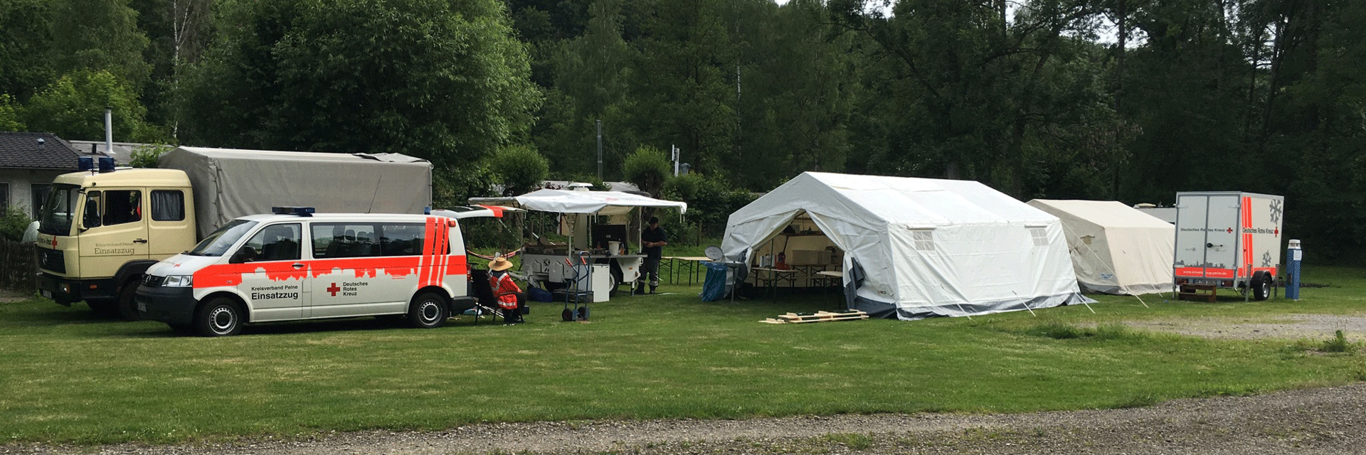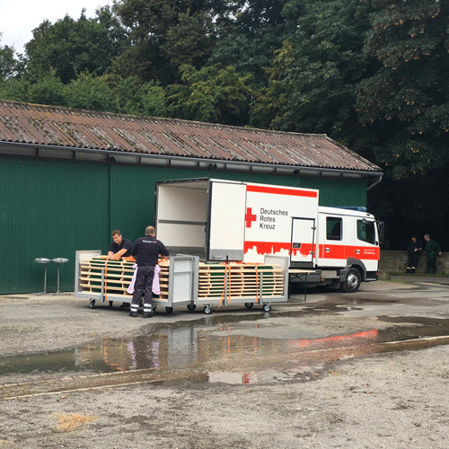 Nach der Alarmierung wird der LKW beladen mit Zubehör (Teller, Besteck, Kochgeschirr etc.) und die Feldküche angehängt.